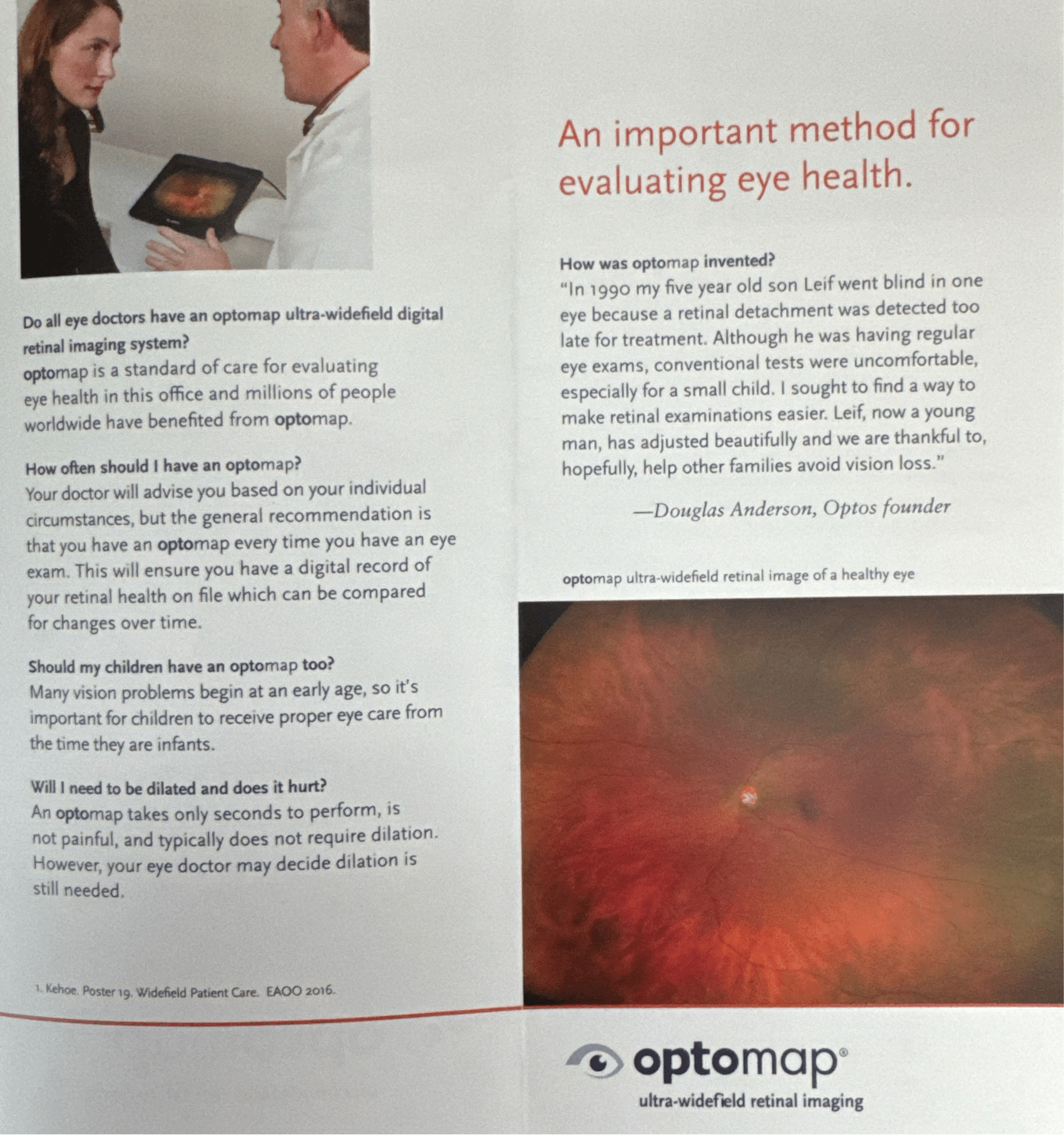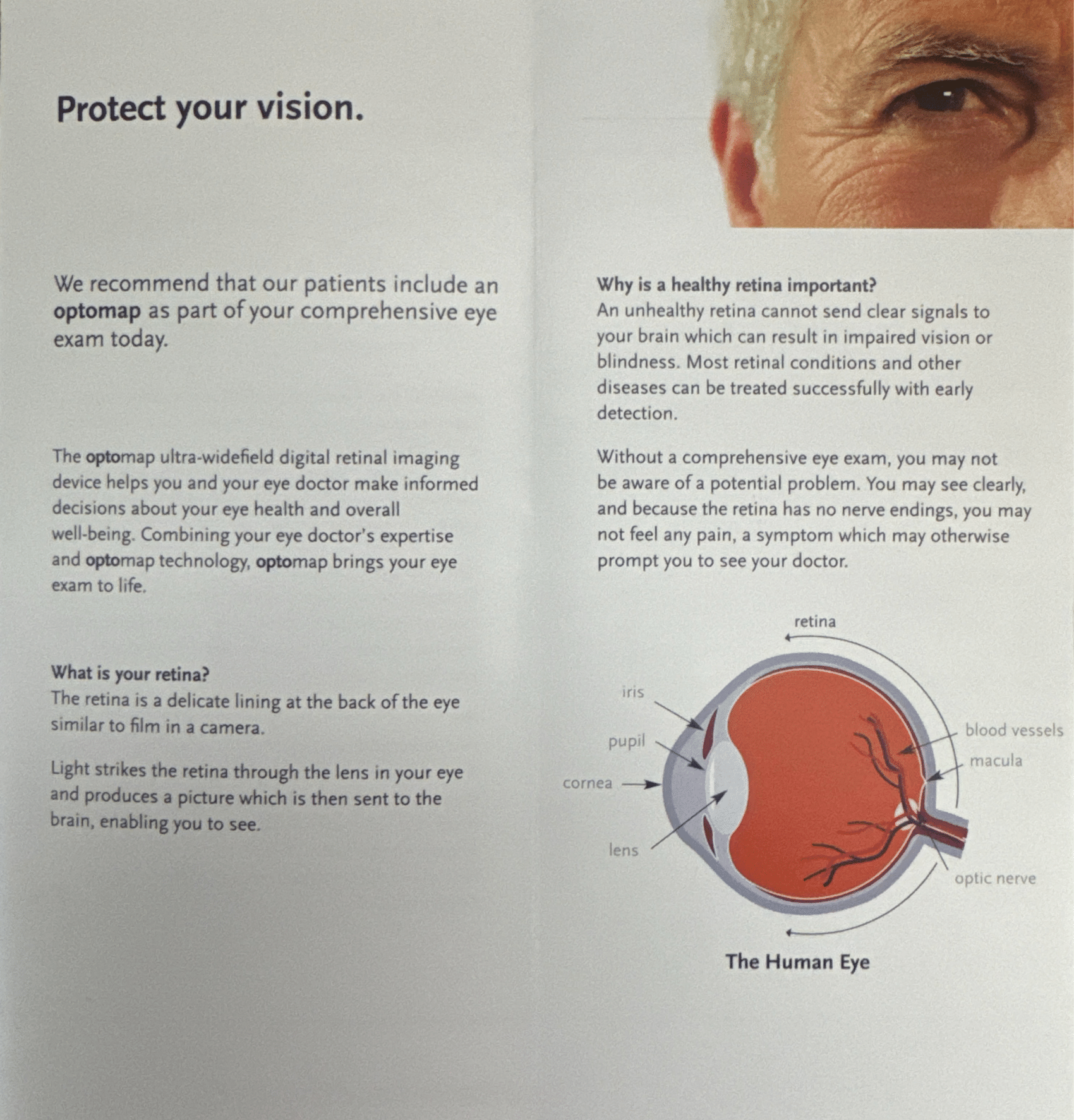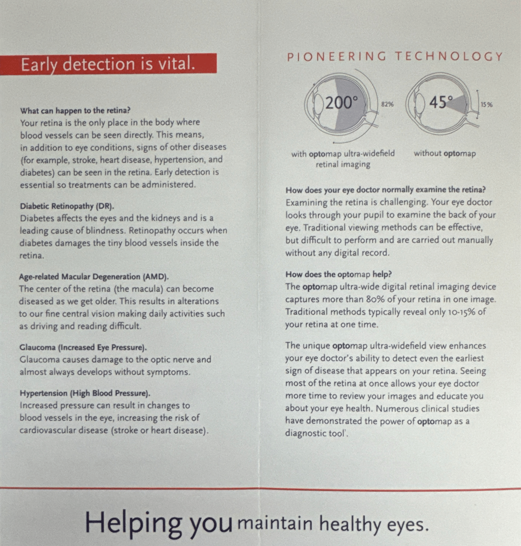 We recommend that our patients include an optomap as part of your comprehensive eye exam today. The optomap ultra-widefield digital retinal imaging device helps you and your eye doctor make informed decisions about your eye health and overall well-being. Combining your eye doctor’s expertise and optomap technology, optomap brings your eye exam to life.